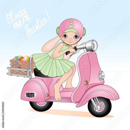 Easter Bunny Rabbit Girl Riding Scooter Ester Buny In Green Dress Delivers Basket With Colored Eggs For Eg Hunt Handwritten Happy Easter Text Blushed Furry Cartoon Hare Character On Pink Bike Vector Buy This