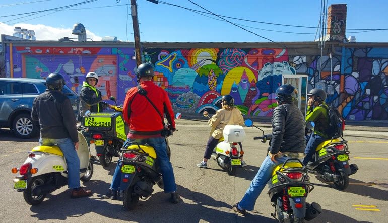 A Guided Motor Scooter Tour On Vespa Mopeds In Denver Usually Includes Stops In The Alleys Filled With Gr Denver Sites And Sights For Scooter Riders In 2019 Vespa Motor
